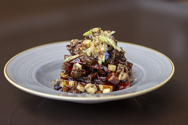 Le premier est un entremet au chocolat noir en mousse, biscuit au beurre et amaretto, gelée de gingembre, le tout recouvert de velour blanc et surmonté d'une tuile à l'érable.