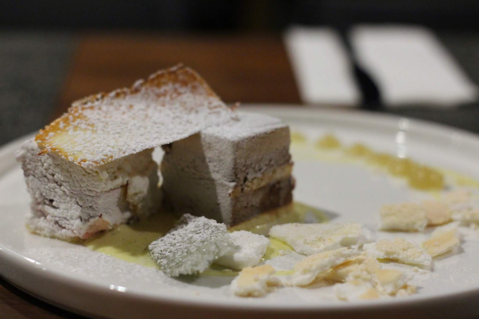 Le premier est un entremet au chocolat noir en mousse, biscuit au beurre et amaretto, gelée de gingembre, le tout recouvert de velour blanc et surmonté d'une tuile à l'érable.